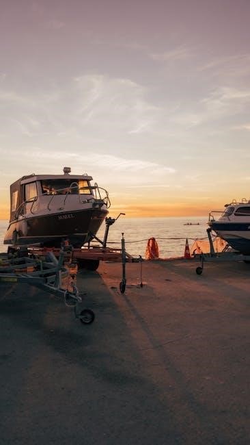 When loading or unloading your boat, ensure the trailer is properly aligned with the boat’s centerline to maintain balance. Always use the boat guides to help center the vessel on the trailer. Move the boat slowly and straight to avoid misalignment. Secure the boat to the trailer using tie-down straps and ensure all safety chains are properly attached. Never load or unload in shallow water, as this can damage the guides or the boat. Always inspect the ramp area for obstacles and ensure the surface is level. Use a spotter if possible to guide you during the process. After loading, double-check that the boat is securely fastened to prevent shifting during transport. Regular practice will improve your technique and reduce the risk of accidents. Proper loading and unloading are critical for safe towing and protecting your equipment.
